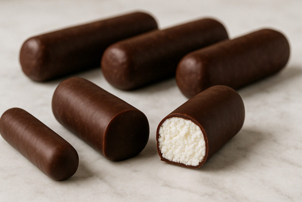 Túró Rudi typically measures about 12 centimeters in length and 2.5 centimeters in diameter. Its cylindrical shape features a dark chocolate shell that encases a soft, white interior. The cheese filling has a moist, spreadable consistency with a slight graininess from the curds.